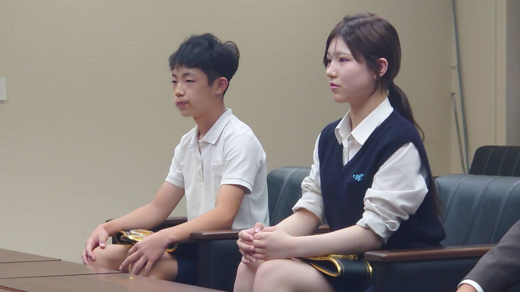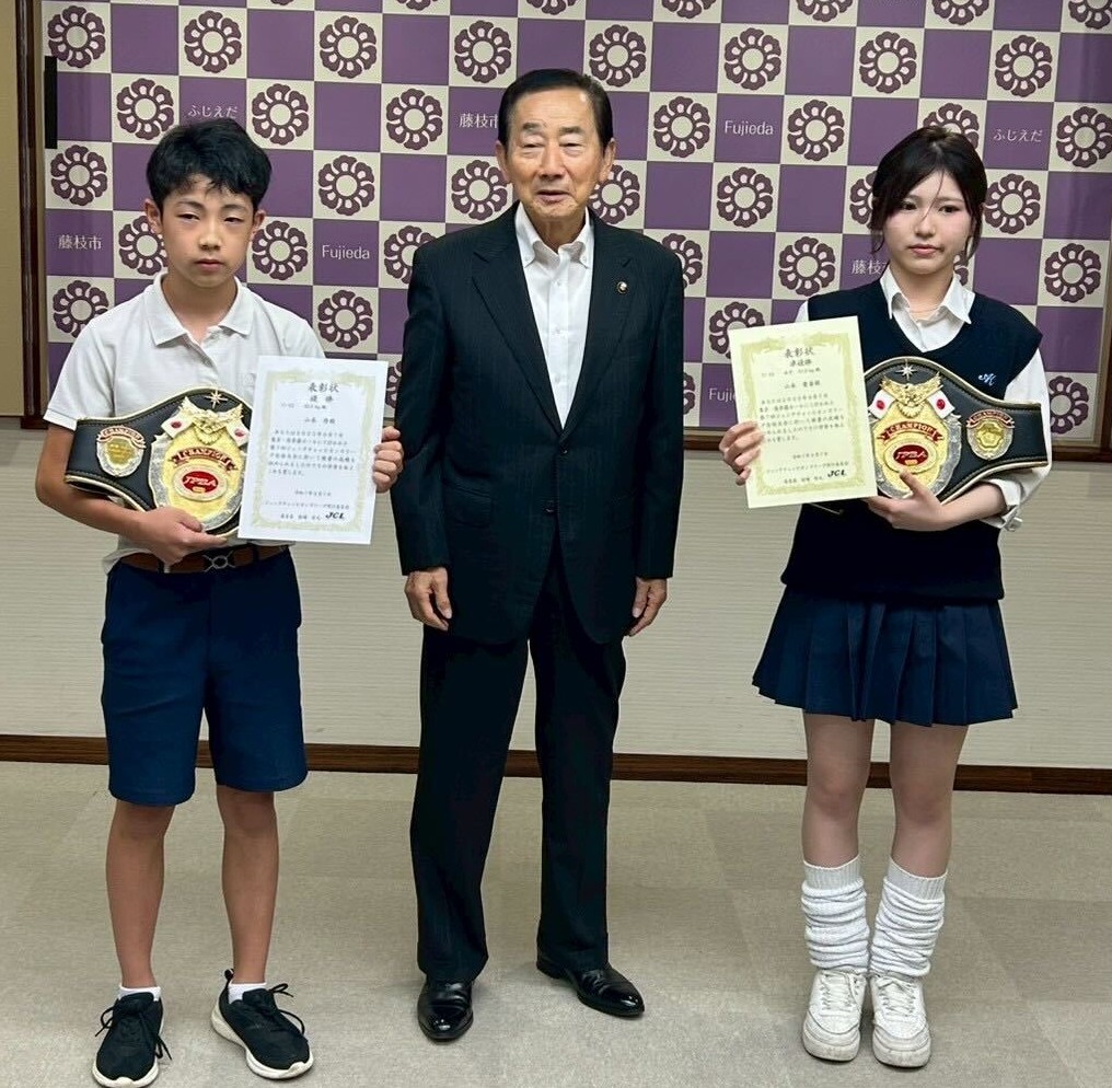 9月に行われたジュニア・チャンピオンズリーグ全国大会決勝戦に出場した山本 啓(青島北小6年)、山本 愛苺(青島北中2年)が藤枝市役所を訪問。